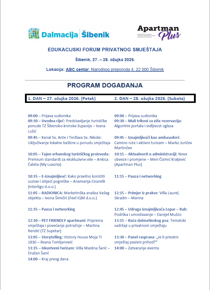 Privatni iznajmljivači iz Pirovca i okolice imaju priliku sudjelovati na jednom od najvažnijih edukativnih događanja ove sezone. U Šibeniku se 27. i 28. ožujka 2026. održava Edukacijski forum privatnog smještaja, dvodnevni program namijenjen svima koji žele unaprijediti svoje poslovanje i povećati broj rezervacija.